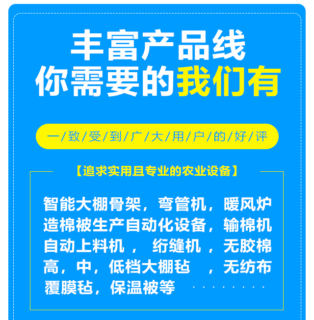 本公司設備齊全,可生產(chǎn)智能大棚骨架,彎管機,暖風爐等農(nóng)業(yè)設備,另制造棉被生產(chǎn)自動化設備,自動上料機,輸棉機,絎縫機等。質量可靠,注重創(chuàng)新。公司擁有雄厚的實力,先進的生產(chǎn)線,豐富的經(jīng)驗,可根據(jù)客戶的要求定做高,中,低檔大棚氈,無紡布,無膠棉,覆膜氈,保溫被等,車間日生產(chǎn)新型棉被10000平方米以上,能滿足各種客戶的需求,新型保溫被產(chǎn)品在國內(nèi)研發(fā)中始終保持在前列。